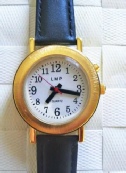 Montre parlante femme, dorée, fond bleu..….……......….…….sans alarme  bracelet cuir  noir