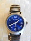 Montre parlante femme, dorée, fond bleu….....………….………sans alarme  bracelet métallique extensible